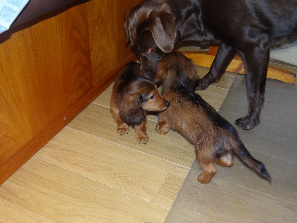 .......maar Mabell heb ik me nog het meest over verbaasd.Das een echt moedertje geworden.Als de pups klieren met elkaar,blaft ze en moeten ze ophouden.Piept er 1,hup gelijk is ze er.Zijn ze brutaal(naar haar toe)zet ze ze op hun plek.s'avonds is die arme ziel ook bekaf...als de pups in de bench gaan,gaat Mabell ook op de stoel liggen en valt in een diepe slaap.We houden goed in de gaten dat Mabell voor alles gaat,dan Goldy en dan pas de pups.Als ze ze corrigeert en een pup jankt,pakken we ze ook niet op(alhoewel je hart af en toe wat anders zegt bij zo'n klein mupje