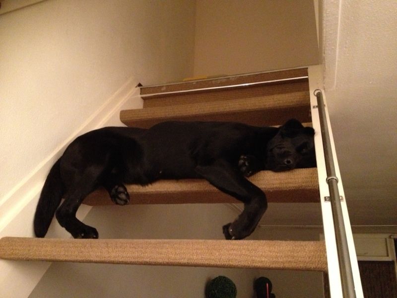 - Als je zegt: 'wat is dat?' dan holt hij naar het voorraam, stijgert even en kijkt dan of er echt iets aan de hand is. Als er toevallig iemand voorbij het raam loopt (we hebben lage ramen dus hij kan alles zien), gaat hij nog veel harder te keer (want owee als ze te dicht langs 'zijn' raam lopen). Blijkt er niks aan de hand te zijn, dan holt hij hard 'meukend' naar de schuifpui. Helemaal verdwaast, want hij denkt dat hij toch iets gemist heeft en het moet zoeken...